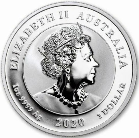 6th crowned portrait of HM Queen Elizabeth II facing right (the Commonwealth effigy), wearing the George IV State Diadem, the Coronation Necklace and Earrings framed by inscriptions “ELIZABETH II,” “AUSTRALIA,” above, weight, purity, and metal content "1oz 9999 Ag" and 1 DOLLAR, and the coin's mintage year, "2020" below.