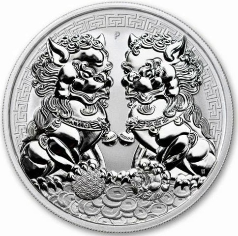 The reverse of the coin features a representation of a Pixiu pair also known as Guardian Lions facing each other (look like they have the head of a dragon and the body of a lion). The Pixiu were believed to have an insatiable appetite for gold and silver which is why the lions in this picture are sitting upon a mound of ancient Chinese coins. One grasps a ball and the other a Pixiu cub. The design also includes a stylised pattern and The Perth Mint's traditional ‘P' mintmark and the designer's initials (IJ) below right on the dragon's leg below.