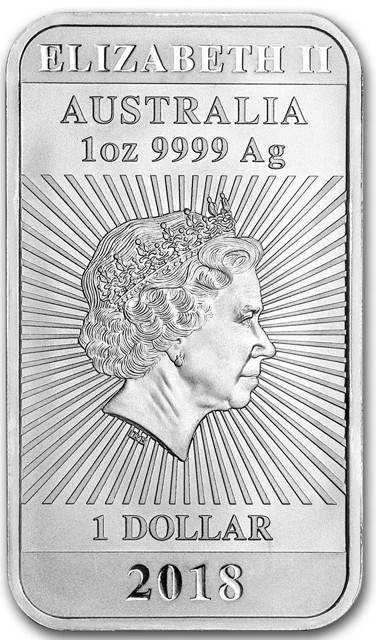 Fourth crowned portrait of HM Queen Elizabeth II facing right, wearing the Girls of Great Britain and Ireland tiara highlighted by a radiant sunburst background, framed by inscriptions ELIZABETH II, AUSTRALIA, above, weight, purity, and metal content "1oz 9999 Ag" and 1 DOLLAR, and the coin's mintage year, "2018" below.
