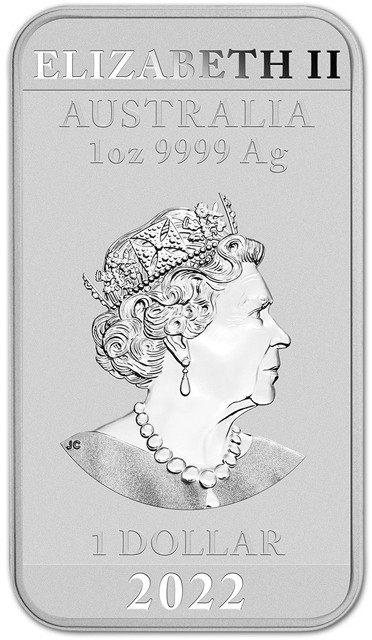 6th crowned portrait of HM Queen Elizabeth II facing right (the Commonwealth effigy), wearing the George IV State Diadem, the Coronation Necklace and Earrings framed by inscriptions “ELIZABETH II,” “AUSTRALIA,” above, weight, purity, and metal content "1oz 9999 Ag" and 1 DOLLAR, and the coin's mintage year, "2022" below.