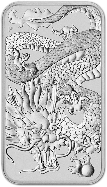 The coin’s rectangular shape provides the perfect canvas on which to portray the a very detailed design of coiled dragon in its full glory. As well as chasing a magical flaming pearl, a symbol of wisdom and prosperity. The coin’s reverse also includes a security feature in the form of a micro-laser engraved The Perth Mint’s “P” mintmark below left and the designer's initials "SR" in tiny letters above right, on the scales of the beast's tail