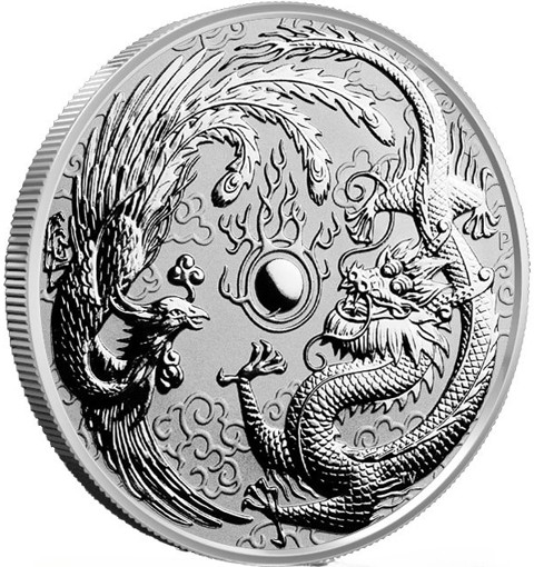 The reverse features two critical mythical beasts from Chinese culture. On one side of the design field, a dragon serpent slithers along as a phoenix is featured on the other side of the design field pursuing the same pearl of wisdom the dragon chases. The background field includes stylized clouds. In the right field, The Perth Mint’s traditional ‘P’ Mint Mark appears and the designer's initials (TV) below right on the dragon abdomen.