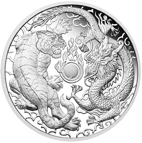 The reverse features the image of a dragon and tiger circling a flaming pearl. the pursuit of which represents the desire for infinite wisdom. Within the concept of feng shui, the dragon and tiger combined together represent perfect balance, The tiger represents the female energy of yin, while the dragon represents the male or yang. In the right field, The Perth Mint’s traditional ‘P’ Mint Mark appears and the designer's initials (TV) below left on the tiger 's left hind foot.
