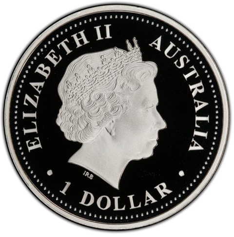 Fourth crowned portrait of HM Queen Elizabeth II facing right, wearing the Girls of Great Britain and Ireland tiara. surrounded by the inscriptions “ELIZABETH II,” “AUSTRALIA,” and the face value “1 DOLLAR.”