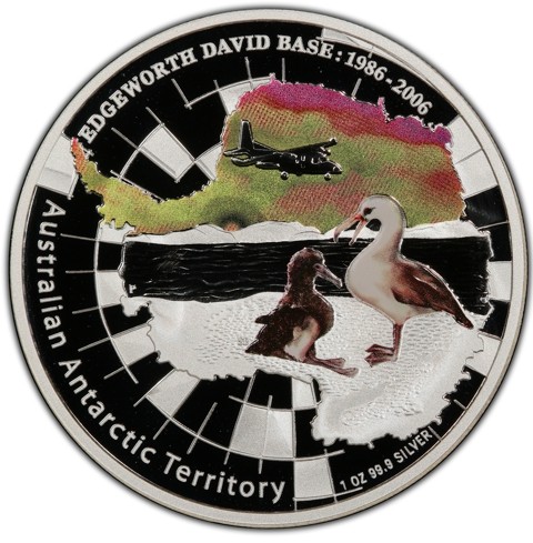 The main design, which appears within the outline of Antarctica, is symbolic of the site of Edgeworth David, where permanent sea ice is suitable for use as an aircraft runway. Colored elements include an Albatross and its chick, The inscriptions include "EDGEWORTH DAVID BASE : 1986 - 2006" and "Australian Antarctic Territory." In the left field, The P mint mark of the Perth Mint. The designer's initials (SB) are in the middle behind the chick.