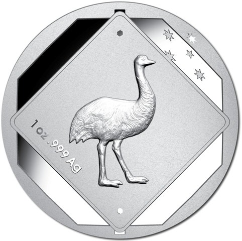 Within an octagon rim, the reverse features an iconic diamond-shaped “emu Crossing” road sign as seen on the roads of Australia to alert drivers for emu potentially crossing the road, features Australia’s iconic native bird, the emu, which stands proudly on the Commonwealth Coat of Arms. with a shining finish for the background. The metal, weight and purity marks "1 oz .999 Ag" are etched along diagonally below left. Behind the sign, five stars of the Southern Cross constellation from the Australian flag dot the distance.