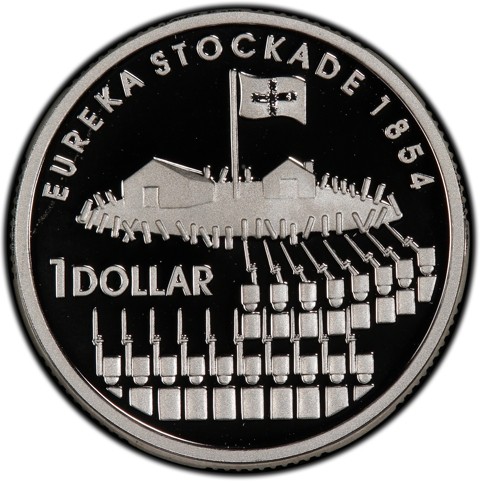 The reverse shows the colonial military forces arrayed in front of the famed Eureka Stockade. Flying over the stockade is the symbolic Eureka flag with the stars of the Southern Cross prominent. This act of rebellion, courage and the raising of the crudely made blue and white flag is seen today as the origin of the Australian Spirit, the 'Eureka' flag has become a symbol of democracy and Eureka the birthplace of the Australian Spirit.