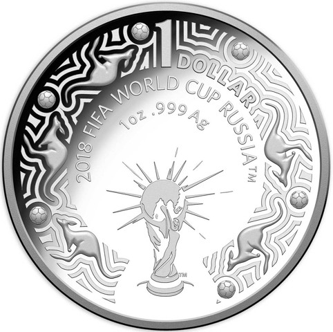 The reverse of the coin depicts a shining FIFA World Cup Trophy surrounding by a pattern of footballs and kangaroos above inscription identify theme accompanied date "2018 FIFA WORLD CUP RUSSIA ™" and the coin’s metal, weight and purity"1oz .999 Ag" is inscribed below it. The face value “1 DOLLAR” is inscribed close to the top rim.