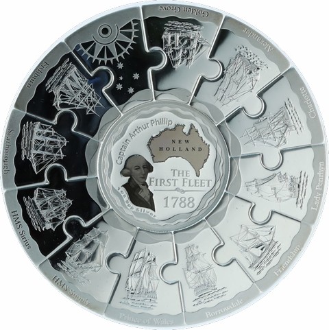 The reverse is richly detailed, featuring engravings of famous vessels such as HMS Sirius, HMS Supply, Scarborough, Prince of Wales, Alexander, Charlotte, Lady Penrhyn, and others, arranged in a circular design. At the center, a portrait of Captain Arthur Phillip, the fleet’s commander, appears alongside the inscription “NEW HOLLAND – THE FIRST FLEET 1788” within a circular border of stylized waves incorporating the Perth Mint’s ‘P’ mintmark at the left side below the designer's initials (GM) appears discreetly and the metal, purity and weight "1oz 999 Silver" below the portrait.