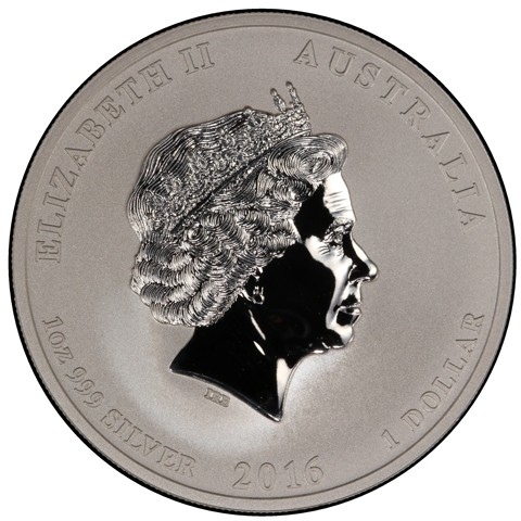 Fourth crowned portrait of HM Queen Elizabeth II facing right, wearing the Girls of Great Britain and Ireland tiara. surrounded by the inscriptions “ELIZABETH II, AUSTRALIA, face value "1 DOLLAR" – date "2016," metal, purity and weight "1oz 999 SILVER.”