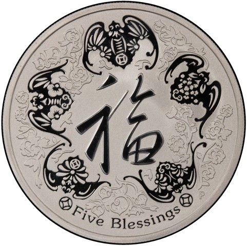 This coin’s design shows five bats representing the five blessings of longevity, wealth, health with composure, virtue and a natural death in old age. The engraved curves of the bats along with vines and flowers surround the character for prosperity, a charming pun as the prosperity character is pronounced the same as the character for bat. The peach flowers and peonies symbolize longevity, immortality, royalty, virtue, wealth and honor in their own right. The inscription 'Five Blessings' is inscribed close to the bottom rim along with The Perth Mint 'P' mark.
