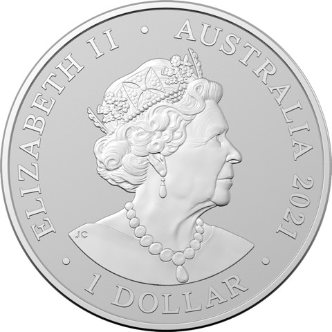 6th crowned portrait of HM Queen Elizabeth II facing right (the Commonwealth effigy), wearing the George IV State Diadem, the Coronation Necklace and Earrings framed by inscriptions ELIZABETH II, AUSTRALIA, the coin's mintage year, "2021" and the face value “1 DOLLAR” below.