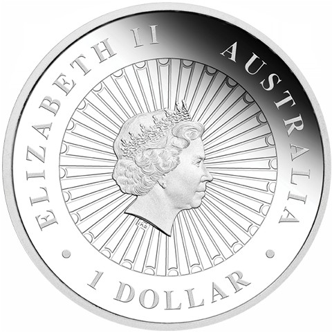 Fourth crowned portrait of HM Queen Elizabeth II facing right, wearing the Girls of Great Britain and Ireland tiara, highlighted by a radiant sunburst background surrounded by the inscriptions “ELIZABETH II,” “AUSTRALIA, 2015,” and the face value “1 DOLLAR.”