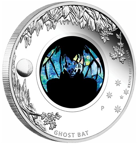 The reverse features a central opal inlay, where the shimmering gemstone has been laser-cut to depict a detailed a flying Ghost Bat, radiating with iridescent flashes of blue, green, and fiery hues. Around the opal are finely engraved the Southern Cross constellation a renowned star group which is only visible in the Southern hemisphere, intricate caves and Kurrajong flowers, a waning gibbous moon, reflecting the animal’s nocturnal nature The inscriptions include "GHOST BAT," alongside the Perth Mint’s “P” mintmark and the the designer's initials (AH) at the opposite on the branch. The metal, weight and purity marks “1oz 999 SILVER,” date "2015" at the right side.