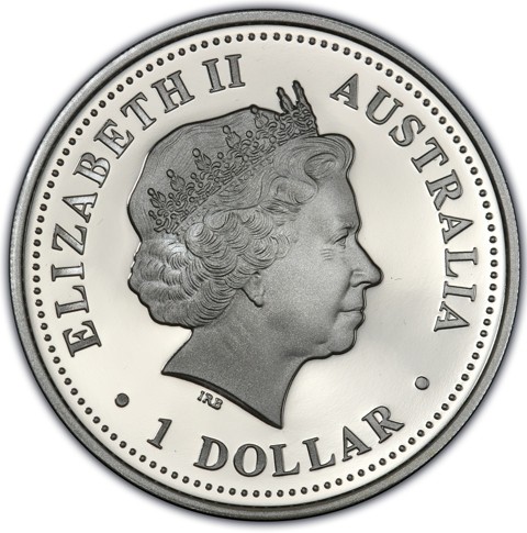 Fourth crowned portrait of HM Queen Elizabeth II facing right, wearing the Girls of Great Britain and Ireland tiara. surrounded by the inscriptions “ELIZABETH II,” “AUSTRALIA,” and the face value “1 DOLLAR.”