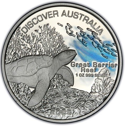 A green sea turtle is featured front and center in frosted cameo relief, set amidst a background of corals and a shoal of fish. The legends GREAT BARRIER REEF and DISCOVER AUSTRALIA define the theme. The Perth Mint's "P" mint mark is judiciously hidden in the coral to the lower right, near the 5:00 position along the rim. The legend 1 OZ 999 SILVER guarantees the weight and purity. In the left field, and the designer's initials (JR ) appears discreetly on the turtle's abdomen.