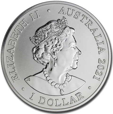 6th crowned portrait of HM Queen Elizabeth II facing right (the Commonwealth effigy), wearing the George IV State Diadem, the Coronation Necklace and Earrings framed by inscriptions ELIZABETH II, AUSTRALIA, the coin's mintage year, "2021" and the face value “1 DOLLAR” below.