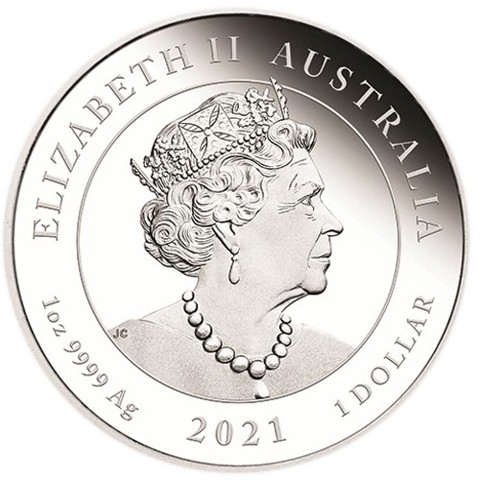 6th crowned portrait of HM Queen Elizabeth II facing right (the Commonwealth effigy), wearing the George IV State Diadem, the Coronation Necklace and Earrings framed by inscriptions “ELIZABETH II,” “AUSTRALIA,” above, weight, purity, and metal content "1oz 9999 Ag" and 1 DOLLAR, and the coin's mintage year, "2021" below.