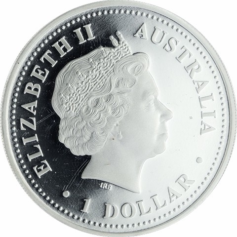 Fourth crowned portrait of HM Queen Elizabeth II facing right, wearing the Girls of Great Britain and Ireland tiara. surrounded by the inscriptions “ELIZABETH II,” “AUSTRALIA,” and the face value “1 DOLLAR.”