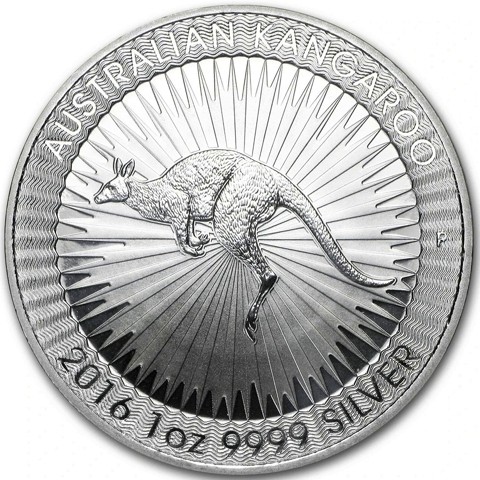 On the reverse is the iconic image of a red kangaroo hopping through the outback, with a background that depicts the stretching rays of the sun surrounded by wavy lines. The inscription at the top is "AUSTRALIAN KANGAROO". The inscription of "2016 1 OZ 999 SILVER" found at the bottom denotes the year, weight, content, and purity. In the right field, The P mint mark of the Perth Mint is present.