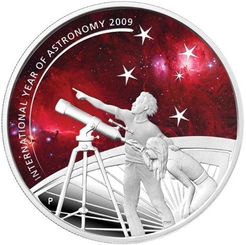 The reverse side showcases symbolic elements like telescopes and celestial bodies, capturing the spirit of discovery and scientific inquiry by portraying two young man and woman observing a colored representation of the night sky with a telescope alongside The Perth Mint's 'P' mintmark, and a stylized depiction of the Southern Cross constellation and the inscription INTERNATIONAL YEAR OF ASTRONOMY 2009.