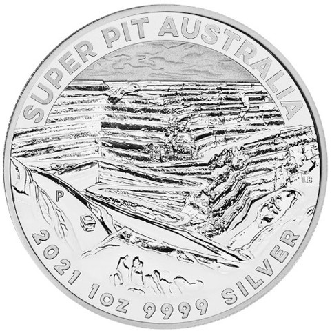 The reverse of the coin features an artistic bird's-eye view of the deep chasm of Super Pit Gold Mine in Western Australia, with a tiny loaded truck seen in the left part of the image for scale comparison. Engravings on this face of the coin identify the name of the series "SUPER PIT AUSTRALIA" around above, the year of issue, weight, purity, and metal content are inscribed close to the bottom rim. In the left field, The Perth Mint’s ‘P’ mintmark appears and the the designer's initials (LB) are also incorporated into the design at the opposite.