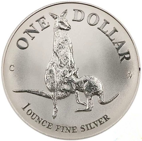 The reverse features an Eastern Grey Kangaroo and a joey. Below right, the monogram of the designer (HH.) surrounded by, the face value ONE DOLLAR, above and the coin’s weight and fineness are also present, along with the ‘C’ (for Canberra) mint mark of the Royal Australian Mint.