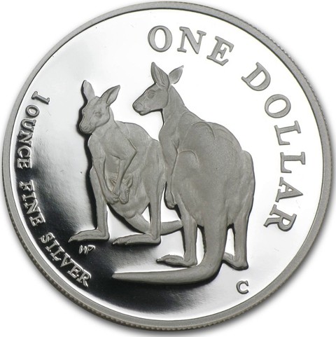 The reverse depicts a mother kangaroo with a joey in her pouch alongside an adult male kangaroo, around above right the monetary denomination and face value ONE DOLLAR. Around below left purity and weight. The monogram of the designer (WP) below left along with the 'C' Canberra mint mark in the lower right field.