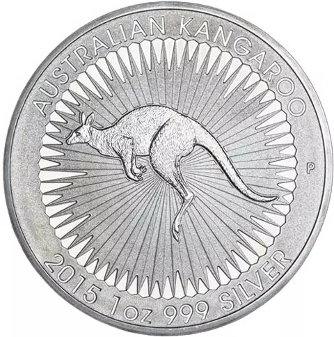 The reverse features a hopping red kangaroo with a sunburst pattern surrounded by wavy lines. The inscription at the top is "AUSTRALIAN KANGAROO". The inscription of "2015 1 OZ 999 SILVER" found at the bottom denotes the year, weight, content, and purity. In the right field, The P mint mark of the Perth Mint is present.