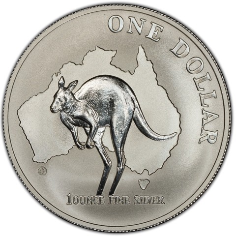Within a plain border, the reverse of the coin depicts a leaping kangaroo against a recessed silhouette of the map of Australia in the background. The face value ONE DOLLAR around above right. Horizontally below, the metal purity and weight "1 OUNCE FINE SILVER."