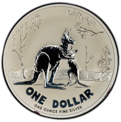 Within a plain border, the reverse depicts a mother and a joey in a hug, with trees in the background. On the grass on the right, the signature of the artist (Rolf ). Around below, the face value ONE DOLLAR, below which in smaller letters the the metal, weight and purity "ONE OUNCE FINE SILVER."