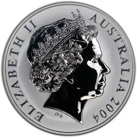 Fourth crowned portrait of HM Queen Elizabeth II facing right, wearing the Girls of Great Britain and Ireland tiara, framed by inscriptions ELIZABETH II, AUSTRALIA, and the coin's mintage year, "2004" below.