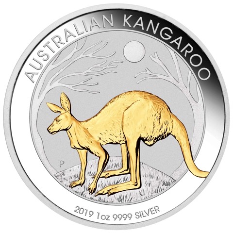 The coin’s reverse depicts a gilded in 24 carat gold adult kangaroo crouching in front of a rural landscape. Completing the picture is a representation of the sun, signifying the hot, arid conditions for which the land is justly famous bordered by the inscription AUSTRALIAN KANGAROO, the year of issue, weight, purity, and metal content "2018 1oz 9999 SILVER" are inscribed close to the bottom rim. In the left field, The Perth Mint’s ‘P’ mintmark appears below and the the designer's initials (AH) are also incorporated into the design at the opposite on the ground below right.