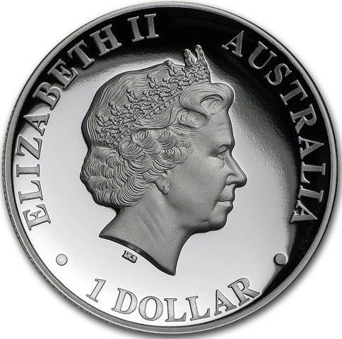 Fourth crowned portrait of HM Queen Elizabeth II facing right, wearing the Girls of Great Britain and Ireland tiara. surrounded by the inscriptions “ELIZABETH II,” “AUSTRALIA,” and the face value “1 DOLLAR.”