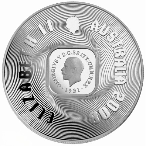 The reverse design shows the reverse of a 1921 Kookaburra Penny, type 12 (features Kookaburra standing on small branch facing right; above, AUSTRALIA; below, ONE PENNY) surrounded by inscription (1921 KOOKABURRA PENNY) above and denomination "ONE DOLLAR" below.