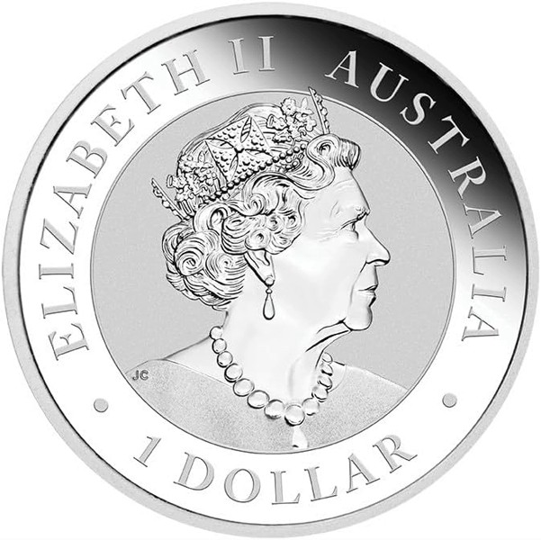 6th crowned portrait of HM Queen Elizabeth II facing right (the Commonwealth effigy), wearing the George IV State Diadem, the Coronation Necklace and Earrings framed by inscriptions “ELIZABETH II,” “AUSTRALIA, 2021,” and the face value “1 DOLLAR”