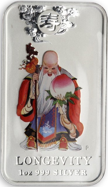 The reverse presents a full-color image of Shou Xing, the Chinese God of Longevity, holding a large peach — the fruit of immortality — symbolizing health and long life. He is shown with a staff in one hand and the peach in the other, richly dressed in flowing robes of red, blue, and gold. Above him, intricate silver clouds frame the Chinese character for “Longevity” (壽), further enhancing the theme. Below, the inscriptions read “LONGEVITY 1oz 999 SILVER.” The Perth Mint “P” mintmark below right.