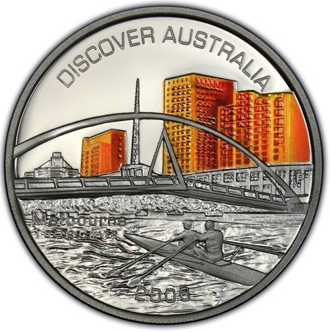 The reverse features a view of Melbourne from the Yarra River illustrations of the Melbourne skyline with famous for its beautiful design and stunning the Southgate footbridge or Evan Walker Bridge (is a distinctive pedestrian bridge over Melbourne's Yarra River) and two rowers passing under it and Melbourne CBD (Central Business District) in orange color. The text series around above, the coin's metal, weight and purity with city name in two lines at the left side and year of issue around below. In the right field, The Perth Mint’s “P” mintmark and the designer's initials (JR) appears discreetly below it.