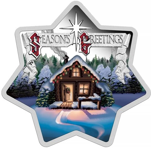 On the star shaped coin reverse features a delightfully winter scene which typifies the modern day notion that Santa lives in a gorgeous log cabin covered by snow lit with Christmas lights, set against a backdrop of a snowy forest of pine trees. The design includes the inscription SEASON’S GREETINGS and the 2017 year-date. In the right field, The Perth Mint’s traditional ‘P’ Mint Mark appears and the designer's initials (TV) at the opposite.