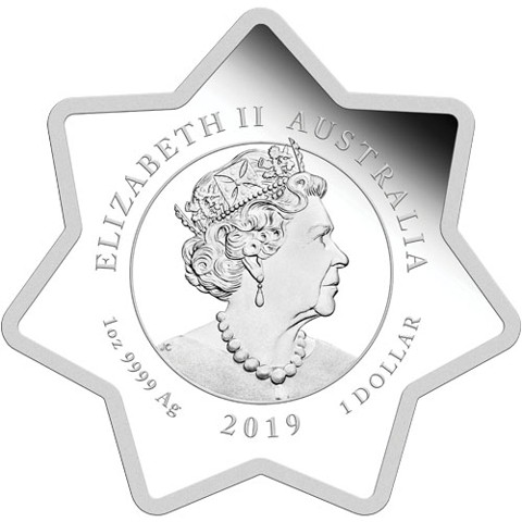 The star shaped coin’s obverse features fourth crowned portrait of HM Queen Elizabeth II facing right, wearing the Girls of Great Britain and Ireland tiara surrounded by the inscriptions “ELIZABETH II, AUSTRALIA, face value "1 DOLLAR" – date "2019," metal, purity and weight "1oz 999 SILVER.”