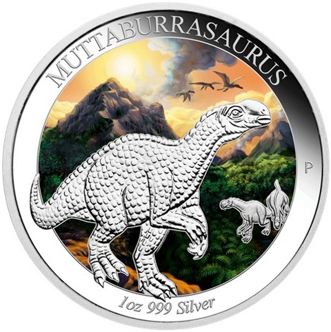 The coin’s reverse portrays a large herbivorous ornithopod Australian dinosaur, Muttaburrasaurus walking set against a vivid colored background of a Prehistoric scene with two Muttaburrasaurus dinosaurs walking in jungle has a volcano and flying pterodactyls. The inscription "MUTTABURRASAURUS" around above, the coin’s metal, weight and purity"1 oz 999 Silver," is inscribed close to the bottom rim. In the right field, The Perth Mint’s ‘P’ mintmark appears and the designer's initials (TV) are also incorporated into the design on the dinosaur's left hind claws.