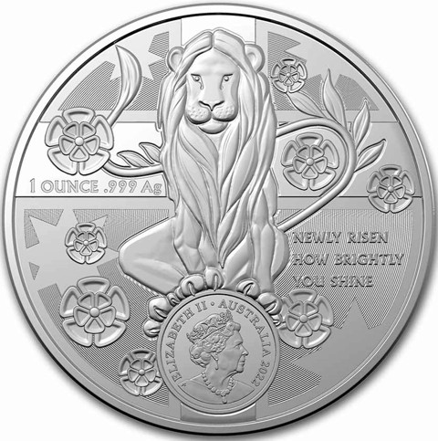 The coin features a highly detailed design inspired by the coat of arms of the state of New South Wales in eastern Australia, which includes a lion and eight-pointed stars, with the British Cross dividing the background and eight British Tudor roses, 6th crowned portrait of HM Queen Elizabeth II facing right (the Commonwealth effigy), wearing the George IV State Diadem, the Coronation Necklace and Earrings framed by inscriptions “ELIZABETH II,” “AUSTRALIA,” and the date “2022” in the lower portion of the design below a massive lion. In addition, the obverse includes information about the weight, purity of the bullion, as well as the motto "NEWLY RISEN HOW BRIGHTLY YOU SHINE.