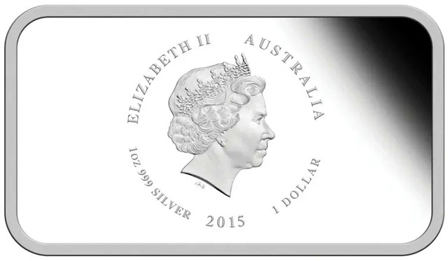 Fourth crowned portrait of HM Queen Elizabeth II facing right, wearing the Girls of Great Britain and Ireland tiara. surrounded by the inscriptions “ELIZABETH II, AUSTRALIA, face value "1 DOLLAR" – date "2015," metal, purity and weight "1oz 999 SILVER.”