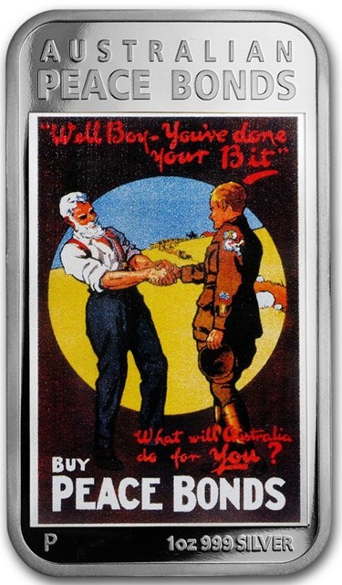 The poster featured an old farmer welcoming a young veteran, symbolizing the assistance that men who were no longer eligible for recruitment could give, highlighting the partnership between the home front and those who fought. The coin’s reverse features a colored representation of the ‘Buy Peace Bonds’ poster headed by the inscription AUSTRALIAN PEACE BONDS. The coin’s metal, weight and purity "1 oz 999 SILVER" at the bottom, with a Perth Mint mark in the bottom-left.