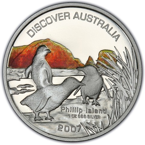 The reverse displays stand three cute little penguins along the shore which is the star attraction of the Phillip Island Nature Park and orange The rocks and rockpools at Cape Woolamai Surf Beach in the background. Around the edge are inscriptions DISCOVER AUSTRALIA – HOBART – 2007 – 1 oz 999 SILVER. In the right field, the designer's initials (JR ) appears discreetly on grasses and The Perth Mint's "P" mint mark at the opposite.