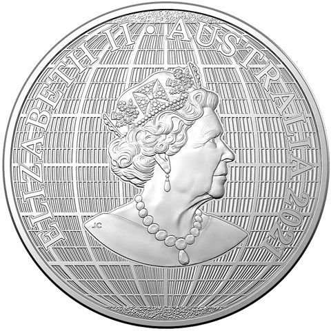 6th crowned portrait of HM Queen Elizabeth II facing right (the Commonwealth effigy), wearing the George IV State Diadem, the Coronation Necklace and Earrings framed by inscriptions “ELIZABETH II,” “AUSTRALIA,” and the coin's mintage year, "2021" below,