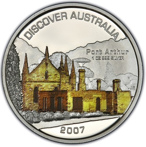 The reverse displays the coloring Old Convict Church at Port Arthur Historic site in Tasmania. Rising majestically in the background is Mount and the Tasmania's Giant Trees as Huon Pine . The design is enhanced with selective coloring, giving depth and warmth to the composition. Around the edge are inscriptions DISCOVER AUSTRALIA – HOBART – 2007 – 1 oz 999 SILVER. In the right field, the designer's initials (JR ) appears discreetly and The Perth Mint's "P" mint mark at the opposite.
