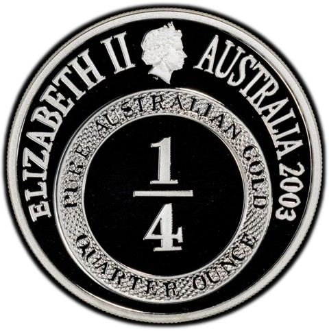 Fourth crowned portrait of HM Queen Elizabeth II facing right, wearing the Girls of Great Britain and Ireland tiara. Below the effigy, reproduction reverse of quarter ounce Port Phillip Pattern coin (shows 1/4 in the center. A broad raised rim features the incuse legend "PURE AUSTRALIAN GOLD ONE OUNCE".); surrounded by ELIZABETH II, AUSTRALIA 2003".