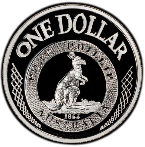 The reverse depicts reproduction the obverse of Port Phillip Pattern coin ( a kangaroo facing right with the date 1853 below. A broad raised engine-turned rim encompasses the incuse legend "PORT PHILLIP AUSTRALIA".); around , cross- hatching" ONE DOLLAR" cross-hatching.