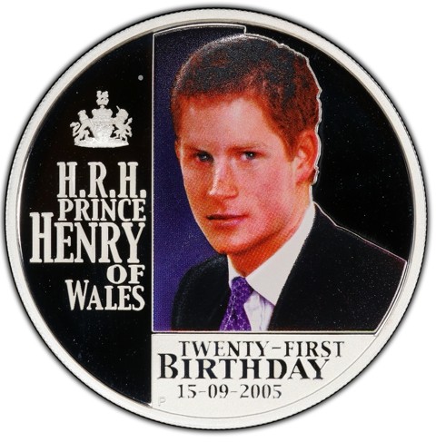 The reverse features a colored portrait of the young Prince Harry in formal attire, divided by a polished silver band with the royal crest. To the left, inscriptions read H.R.H. PRINCE HENRY OF WALES, while below is TWENTY-FIRST BIRTHDAY – 15-09-2005. The Perth Mint’s “P” mintmark appears discreetly at the bottom.